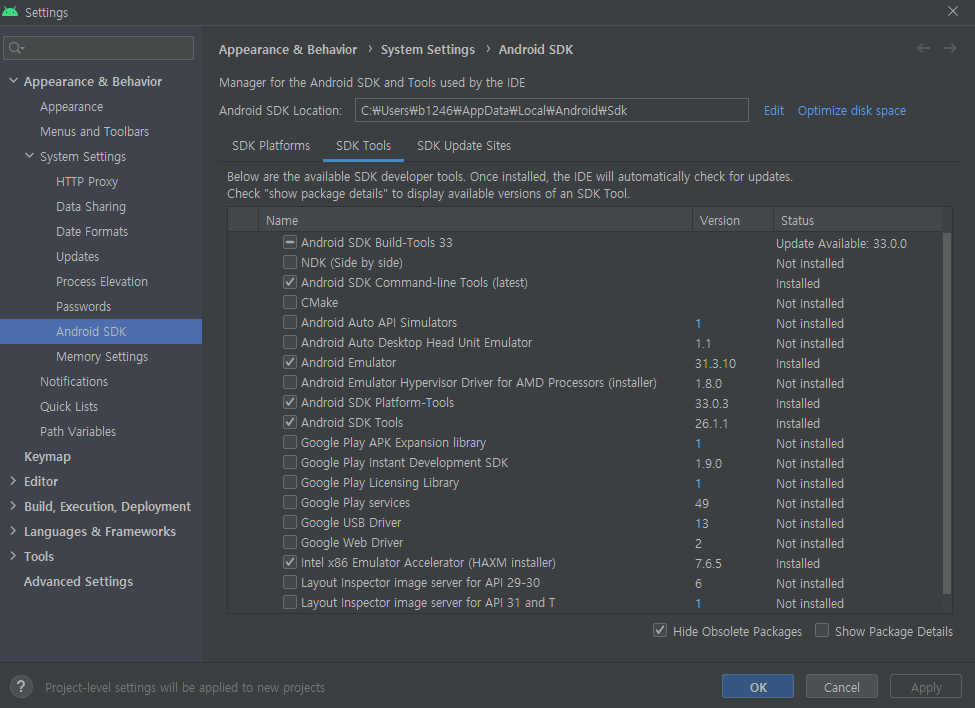 android sdk command-line tools(latest)를 체크후 하단 OK - 설치하라는 내용이 나오면 설치합니다.